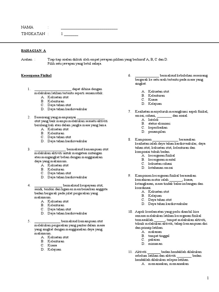 Berikut merupakan beberapa contoh soalan yang terdapat dalam ujian pendidikan jasmani kesihatan tahun 1 ini. Daya tahan otot dapat ditingkatkan melalui latihan litar. UPT Sejarah Tingkatan 1.